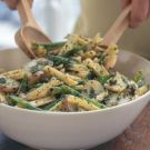 Add the drained pasta to the bowl with the vegetables and then add the pesto. Stir and toss until the pasta and vegetables are evenly coated with the sauce, adjusting the consistency with some of the cooking water if needed. Add the butter and toss to coat evenly. Serve immediately. Serves 4 to 6.