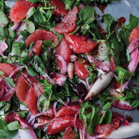 To assemble the salad, put the grapefruit segments, onion, endive, watercress and basil in a large bowl. Pour over three-quarters of the dressing and toss very gently. Add the remainder of the dressing if the salad seems dry; otherwise, keep in the fridge to save for another leafy salad. Serve immediately. Serves 4.