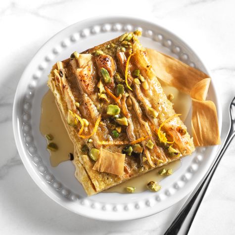 Inspired by baklava, a Middle Eastern dessert of chopped nuts sandwiched between layers of honey-soaked phyllo dough, this pretty cake is elevated with a white chocolate and pistachio custard that holds everything together. If you like, you can use ghee instead of browned butter.