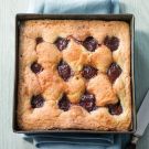 Bake until the top is golden, the edges pull away from the pan and a tester inserted into the center of the buckle comes out clean, 50 to 60 minutes. Let cool on a wire rack for about 30 minutes before serving. Serves 9.