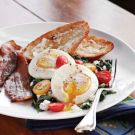 This colorful brunch dish combines fresh spinach with grape tomatoes, ricotta cheese and poached eggs. Crisp bacon slices and buttered toast round out the plates.