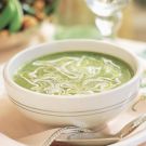 The large poblano chile is extremely versatile. It can be stuffed, cut into rajas (strips), which are used in a variety of ways, or made into this simple yet elegant traditional soup. The area around the town of San Martín Texmelucan, close by the highway between Mexico City and Puebla, is one of the primary growing regions for poblano chiles—a chile named for this state—so it is not surprising that local cooks use them frequently. The creme sweetens the rich spice of the chiles, and the peas lend a brighter green hue to the finished soup.