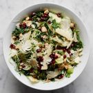 Seeding fresh pomegranates can be messy work, but fresh pomegranate seeds, or arils, are now available in many markets. Giada De Laurentiis, who shares this recipe from her new book Happy Cooking, suggests that to shave the Gorgonzola dolce, place the cheese in the freezer for at least 2 hours. Using a vegetable peeler, shave strips of cheese over the salad. By the time the cheese hits the greens, it will be thawed and ready to eat.