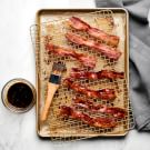 Remove the bacon from the oven. Carefully drain the fat into a medium bowl. Place the baking sheet on a wire rack and immediately brush each slice of bacon with the glaze. Let sit at room temperature until the glaze has set and cooled slightly, about 10 minutes, then serve immediately. Serves 4 to 6.