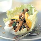 Divide the pork mixture in the center of each lettuce leaf. Top with mango slices, sprinkle with the peanuts and serve immediately. Serves 4.
