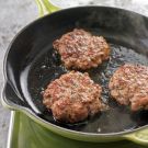 Shape the pork mixture into 6 patties about 3 inches (7.5 cm) in diameter. Heat a large fry pan, preferably nonstick, over medium heat. Add the patties and reduce the heat to medium-low. Cook until the bottoms are browned, about 5 minutes. Flip and cook the other sides until browned and the centers of the patties feel firm when pressed with your finger, about 5 minutes more. Serve hot. Serves 6.
