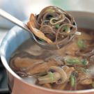 Meanwhile, in a large saucepan over medium-high heat, bring the broth to a boil. Add the soba noodles and stir to separate them. Cook just until tender, about 5 minutes. Add the pork mixture, mushrooms and green onions and cook for 1 minute to heat through. Season with salt and pepper. Ladle the soup into warmed bowls and serve immediately. Serves 4.