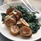 A favorite in Italy, involtini are stuffed rolls, typically made by wrapping thin slices of meat around a savory filling. Here, a pork tenderloin is butterflied and pounded to an even thickness, then stuffed with prosciutto, fontina cheese and fresh sage leaves before cooking. Garlicky spinach makes the perfect accompaniment.