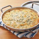 The potatoes should be sliced to a uniform thickness so they cook evenly. A mandoline is a good tool for slicing the potatoes. Any leftovers can be reheated in a 300°F oven for 8 to 10 minutes.