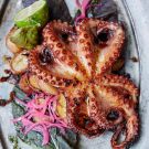 To serve, toss the mustard greens with 1/4 cup (2 fl. oz./60 ml) of the coriander dressing and arrange on 4 serving plates. Pile the roasted potatoes, chiles and onions on the greens. Lightly coat the octopus with the remaining coriander dressing and place atop the vegetables. Garnish each plate with half a lime and the pickled red onions, if using. Serves 4.