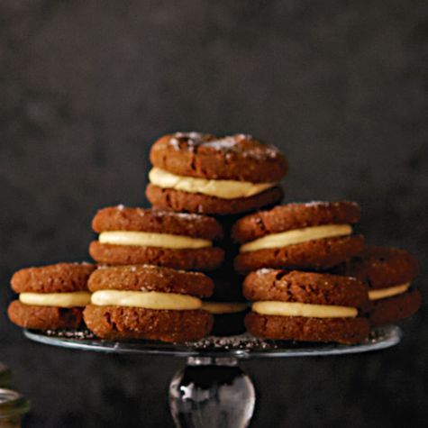 For a fun twist on the traditional sandwich cookie, a cream cheese filling flavored with spiced pumpkin butter is tucked between chewy ginger-molasses cookies. They’re perfect for Halloween parties and other autumn gatherings.