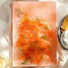 A Himalayan salt plate is excellent for quick-curing meats and fish. For this recipe, use the freshest, top-quality salmon you can find and ask the fishmonger to slice it for you. Be sure to chill the salt plate before using to keep the fish cold and easy to work with. The longer the salmon sits on the plate, the saltier it will become, so adjust the time as desired.