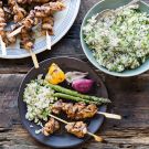 Drain the skewers and thread each, lengthwise and accordion style, with 3 pieces of chicken. Arrange the skewers on the grill directly over the heat and cook, turning once, until the chicken is opaque throughout, 3 to 4 minutes per side. Serve immediately. Serves 4.
