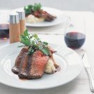 Using a sharp knife, carve the steak across the grain into thin slices. Arrange on warmed plates and spoon the pan juices over the top. Serve immediately. Serves 2.