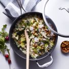 Here we combine three types of brassicas—cauliflower, kale and romanesco—into one delicious dish that’s filled with an array of textures and flavors. The cauliflower is chopped in a food processor to form small pieces that resemble rice, then quickly sautéed with the kale. The romanesco is roasted until nicely browned and tossed into the mix. Chickpeas roasted with smoked paprika lend crunch, while thinly shaved raw radishes add a peppery bite. Serve as a vegetarian main course or as a hearty side for grilled or roasted meats and fish.