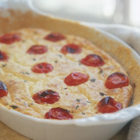 In a bowl, whisk together the ricotta and Parmigiano-Reggiano cheeses, eggs and 1 tsp. of the thyme. Season with salt and pepper. Stir in half of the tomatoes. Scrape the mixture into the prepared dish and smooth the top. Top with the remaining tomato halves, cut side down. Sprinkle with the remaining thyme.