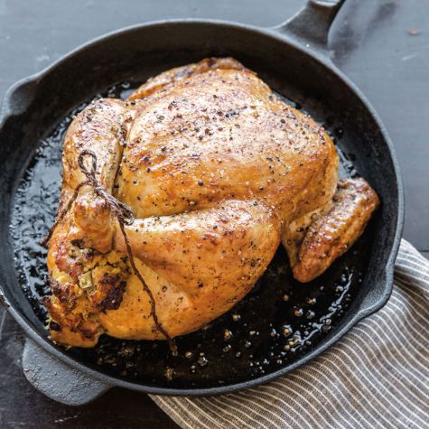 Remove the chicken from the oven, cover loosely with aluminum foil, and let rest for 10 to 15 minutes. Transfer the stuffing from the chicken to a serving dish. Carve the chicken, arrange on a platter, and serve immediately. Serves 4 to 6.