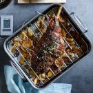 Coated with an herb paste and roasted on the bone, this leg of lamb emerges exceptionally flavorful and is large enough feed a crowd. The juices from the lamb flavor the potatoes, which stay moist beneath the lamb but form a crisp crust elsewhere.