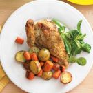 Meanwhile, add the parsley to the potatoes and carrots and stir to combine. Remove the foil from the chicken, carve into serving pieces and arrange on a warmed platter. Serve immediately. Serves 4, with leftovers.