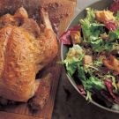 In a large bowl, combine the salad greens, toasted bread cubes, toasted walnuts and dried cranberries. Add the warm vinaigrette and toss to coat. Divide the salad among warmed dinner plates. Cut the chicken into quarters and place a chicken quarter on top of each salad. Serve immediately. Serves 4.
