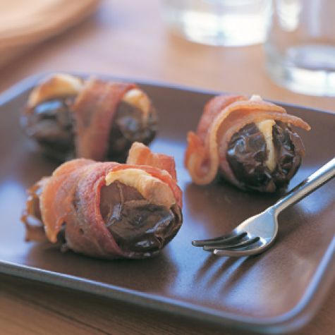 Using pitted dates speeds the preparation. If they are not available, use a small, sharp knife to make a slit along the side of each date and pull out the pit. The bacon will help seal the date so the cheese does not leak out and it will also cover the ragged edges.