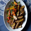 Simple roast potatoes and carrots are elegant enough for entertaining when you choose pretty rainbow-colored baby carrots and garnish the dish with a sprinkling of chopped fresh flat-leaf parsley or other herbs.