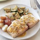 Quick Tips: It’s easiest to zest citrus fruits when they are whole, so in recipes calling for both, remove the zest from the fruit before cutting it in half for juicing. The vinaigrette can be prepared 1 day in advance and refrigerated; bring it to room temperature before serving. It would also be good on tuna or halibut. You can make extra vinaigrette and use it to dress a salad on another night.