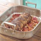 In a bowl, combine the onions and 1 Tbs. of the grilling drizzle and stir to combine. Transfer the onions to a small roasting pan. Put the pork on top of the onions and roast for 20 minutes. Reduce the heat to 375°F and continue roasting until an instant-read thermometer inserted into the center of the meat registers 140°F, about 30 minutes more. Transfer the pork to a carving board, cover loosely with aluminum foil and let rest for 10 minutes.