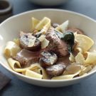 Add the mushrooms to the pan and sauté until golden, about 3 minutes. Add the garlic and cook for 1 minute, then add the sage, stock and cream and bring to a boil. Return the pork to the pan. Transfer to the oven and roast, turning the pork over once and basting occasionally, until the juices run clear when the pork is pierced with a knife, 15 to 20 minutes. While the pork roasts, cook the pasta in a pot of boiling salted water until al dente, according to the package instructions.