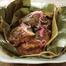 Made in the traditional way, as it is in Mexico’s Yucatán peninsula, cochinita pibil starts with large pieces of bone-in pork rubbed with a spice paste anchored by fragrant red annatto seed and sour orange. The meat is then wrapped in banana leaves and roasted on hot rocks in a deep pit (pib) until meltingly tender and infused with the earthy flavors of the spices and grassy fragrance of the banana leaf. Achiote paste and banana leaves can be found at most Latin markets.