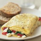 Spoon the red pepper mixture onto the side of the omelet closest to the handle of the fry pan. Sprinkle the mixture with the feta cheese. Using the spatula as a guide, fold the third of the omelet closest to the handle over the center third. Then, holding the pan by the handle, tilt the pan so that the omelet rolls out onto a warmed platter, seam side down.