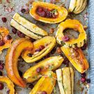 Oil a baking sheet. Trim the ends from each squash and cut into slices or quarters. Scrape out the seeds, reserving some for roasting. Season the slices generously with salt and pepper and arrange on the prepared sheet. Roast for 10 minutes.