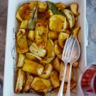 Roast the squash, uncovered, until tender and lightly browned in spots, about 45 minutes, turning the squash once halfway through the cooking time. Transfer the squash pieces to a serving platter and serve immediately. Serves 8.