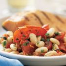 This vegetarian dish is a good source of protein and an excellent source of dietary fiber, vitamin C and many phytochemicals. The creamy texture of the cannellini beans, the mild acidity of the roasted tomatoes and the saltiness of the capers come together in a combination that mates well with grilled fish, or with green vegetables as part of a vegetarian meal.