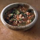 In a soup pot over medium-low heat, warm the remaining 3 Tbs. olive oil. Stir in the carrots, celery, onion and minced herbs and sauté until the onion is softened, 7 to 8 minutes. Stir in the kale and cook until wilted and just tender, 10 to 15 minutes. Stir in the tomato puree, salt and chile and increase the heat to medium. Add the broth and 3 cups (24 fl. oz./750 ml) water and bring to a boil.