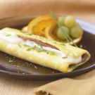 Lay the ham over the eggs, and lay the Brie at the end of the pan opposite from the handle. Hold the pan over a plate. Using the spatula, roll the omelette away from you, enclosing the filling, then roll the omelette over itself and out onto the plate. Serve immediately.