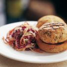 Place the bottoms of the onion rolls on individual plates. Top with the burgers and the tops of the rolls. Spoon the slaw on the side. Serve immediately. Serves 6.