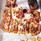 Spread 1/2 cup of the crushed tomatoes evenly over the dough, leaving a 1/2-inch border. Top evenly with one-third each of the mozzarella and salumi. Carefully slide the pizza onto the preheated pizza stone. Bake until the crust is browned and the cheese is melted, 15 to 18 minutes. Using the pizza peel, transfer the pizza to a cutting board and sprinkle with 1 1/2 Tbs. of the basil. Cut into slices and serve immediately. Repeat with the remaining dough and toppings to make 2 more pizzas. Makes 3 pizzas; serves 12.