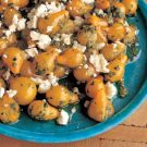 Buttery toasted walnuts and peppery arugula meld with the distinctive flavor of basil to create a bold version of pesto that coats a quick sauté of yellow pear tomatoes. Crumbled feta cheese lends its tangy richness to help bring all the tastes together.