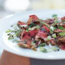 Divide the slices evenly among individual plates, folding the pieces and overlapping them slightly to cover the center of each plate. Scatter the cilantro, mint and green onions over the beef slices. Finish each plate with a drizzle of extra-virgin olive oil and the reserved balsamic syrup. Serve immediately. Serves 4.