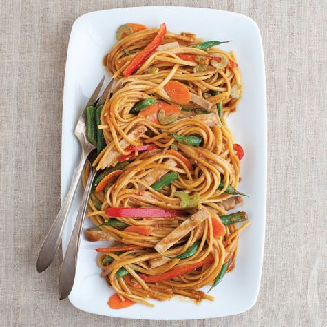 Since this version of the Cantonese favorite is great served cold, it’s an ideal dish for a picnic or to take to a potluck on a warm summer evening. The noodles will continue to soak up the dressing over time, so to serve any leftovers, toss the noodles with an additional 1/4 cup (2 fl. oz./60 ml) or so of warm green tea to re-moisten them. The vegetables used here are just a suggestion; feel free to substitute whatever vegetables you have on hand.
