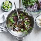 Our exclusive stir-fry starters make it easy to create Asian favorites at home, like this shaking beef, named for the way Vietnamese chefs vigorously shake the wok as they are making it. Lightly peppery watercress is good foil for the rich beef and savory, tangy sauce, but if you can’t find it, you can use arugula instead.