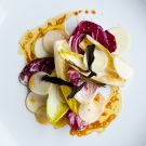 At his restaurant Gather in Berkeley, Executive Chef Sean Baker uses commonly discarded vegetable parts in his dishes, such as the turnip tops that are tossed with this salad. Shave the turnips themselves just a touch thicker than paper-thin to retain the integrity of the vegetable, he says. If you can’t find baby White Doll turnips, substitute Scarlet or Gold turnips.