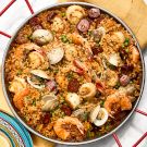 Considered the national dish of Spain, paella can include all manner of meats, seafood and vegetables. We load up ours with three kinds of shellfish—shrimp, clams and scallops—punctuated by smoky-spicy Spanish chorizo. Our time-saving sofrito cooking base streamlines prep, making this dish totally doable even on a weeknight. A backbone in Spanish kitchens, sofrito combines tomatoes, onions and bell peppers with garlic and spices, lending layers of complex flavours to a dish. Be sure to use Bomba rice when preparing your paella. Prized in Spain, this short-grain variety absorbs more broth than other types of rice yet the grains remain firm.