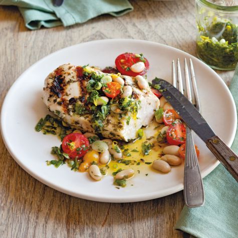 • Grilled Chicken Breasts with Salsa Verde and White Beans