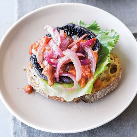 • Portobello Burgers with Caramelized Onions and Tomato-Ginger Jam