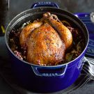 Transfer the chicken to a carving board and let rest for 10 minutes. Pour the pan juices into a gravy boat. Carve the chicken and serve the juices alongside. Serves 4.