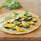 Popular in Provence, socca is a naturally gluten-free flatbread made from chickpea flour. The toppings in this recipe can be varied according to your taste. Summer squash and basil are perfect for summer, but in cooler weather you might want to try Gouda cheese with sautéed portobello mushrooms and thinly sliced radicchio.