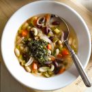 Mimi Thorisson shares this recipe in her book A Kitchen in France, where she explains that this Provençal soup is really just the French version of minestrone, and that the pistou, or pesto, that is stirred in at the end is also borrowed from their Italian neighbors. She continues, “Provençal pesto is usually made without pine nuts, and some versions add tomatoes to the mix, which I like. Leftover pistou is lovely on grilled bread with aperitifs.”