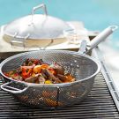 Prepare a medium-hot fire in a grill. Place a steel grill chef’s pan on the grill, cover the grill and preheat.